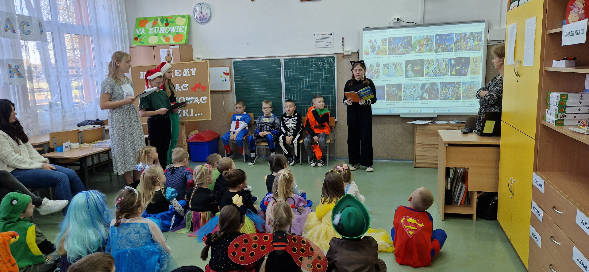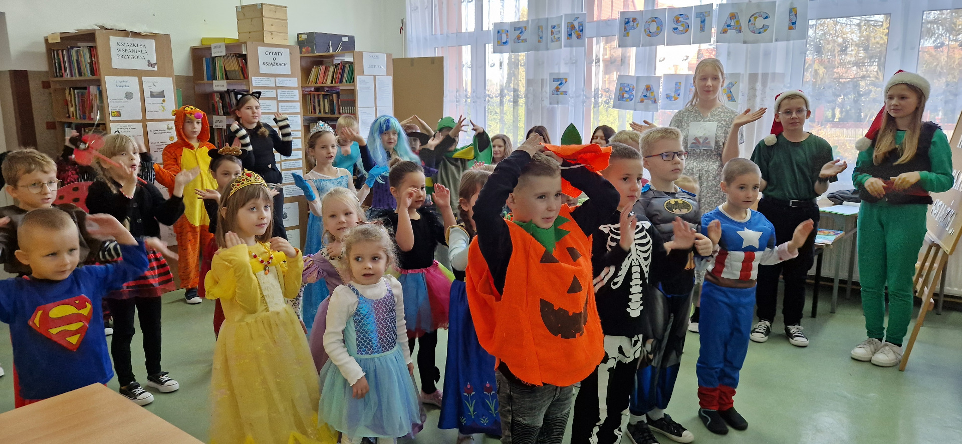 5 listopada w naszej szkole obchodziliśmy Dzień Postaci z Bajek. W tym dniu również uczniowie klasy I zostali pasowani na czytelników szkolnej biblioteki, złożyli przyrzeczenie, obiecali, że będą kochać i szanować książki. Uroczystość poprowadzili uczniowie klas starszych Dorota Bodzon, Michalina Soliwoda oraz Oskar Nowicki. Uczniowie klasy I odgadywali zagadki o bohaterach bajek. Wspaniale się spisali, otrzymali dyplomy, książki oraz prezenty od Samorządu Uczniowskiego. Dziś zostali pełnoprawnymi czytelnikami szkolnej biblioteki. Widownią byli uczniowie klasy 2 i 3 oraz dzieci z przedszkola. Wszyscy zostali obdarowani zakładkami, które nasza szkoła otrzymala za udział w akcji "Przerwa na czytanie ". Dzieci zaprezentowały swoje stroje, bo były przebrane za postaci z bajek, w zabawach ruchowych przy muzyce, świetnie bawiły się przy piosenkach "Góry do góry, "Kaczuszki" i innych. Na koniec dla wszystkich dzieci było słodkie co nieco.