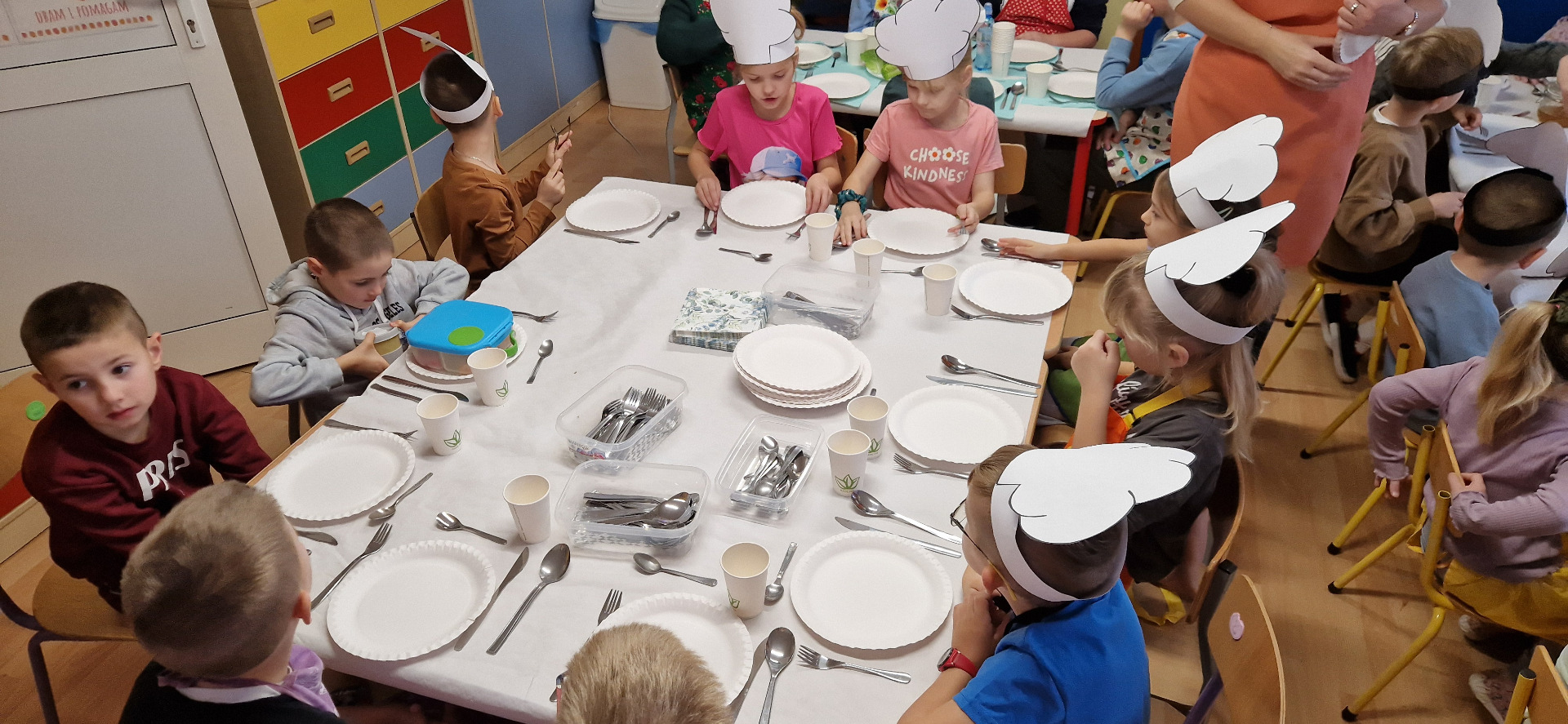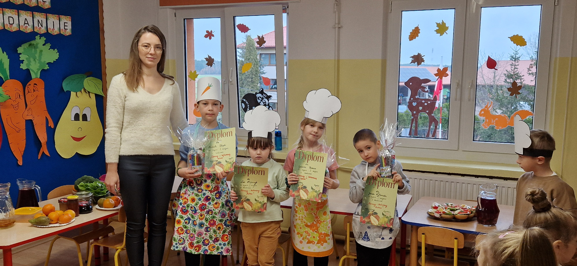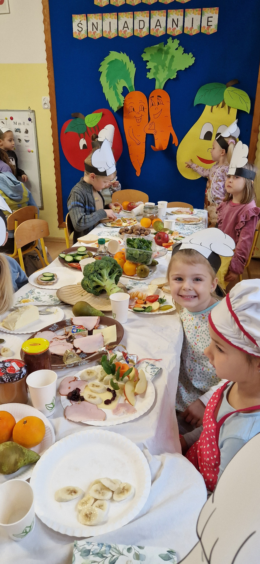 Dzieci dowiedziały się, że najważniejsza jest aktywność fizyczna oraz spożywanie owoców i warzyw, najmniej należy jeść tłuszczy. W piramidzie w ogóle nie ma słodyczy. Dzieci nakryły stół, rozłożyły sztućce. Następnie każda grupa przygotowała talerz owoców i warzyw. Był to konkurs na ,,Zdrowy i kolorowy talerz". Każda klasa wybrała najpiękniejszy, kolorowy talerz. Nagrody i dyplomy otrzymali: Michał Stopka kl. III, Gabriela Roman kl. II, Jakub Wojtasiak kl. I, Lidia Kucharczyk z oddziału przedszkolnego. Pani Dyrektor wręczyła dzieciom dyplomy i nagrody. Dzieci przy wspólnym stole zjadły przygotowane śniadanie. To był miły, smakowity posiłek.