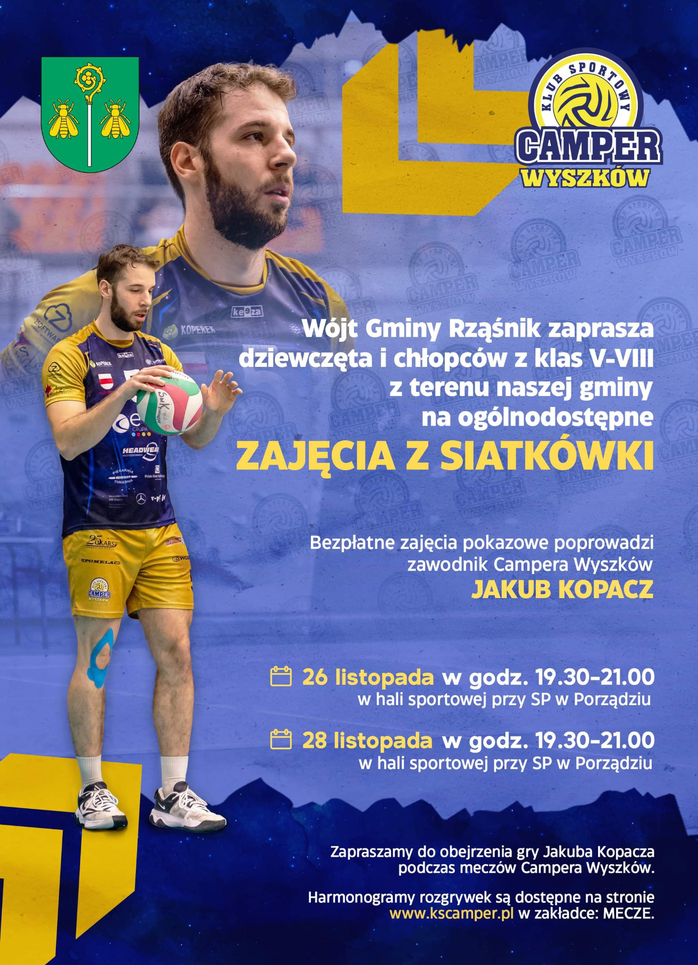 Zapraszamy dziewczęta i chłopców z klas V-VIII z terenu naszej gminy na ogólnodostępne bezpłatne zajęcia z siatkówki! Zajęcia będą prowadzone przez zawodnika Campera Wyszków Jakuba Kopacza.