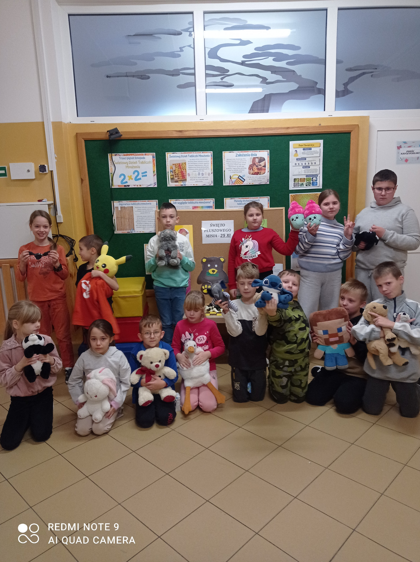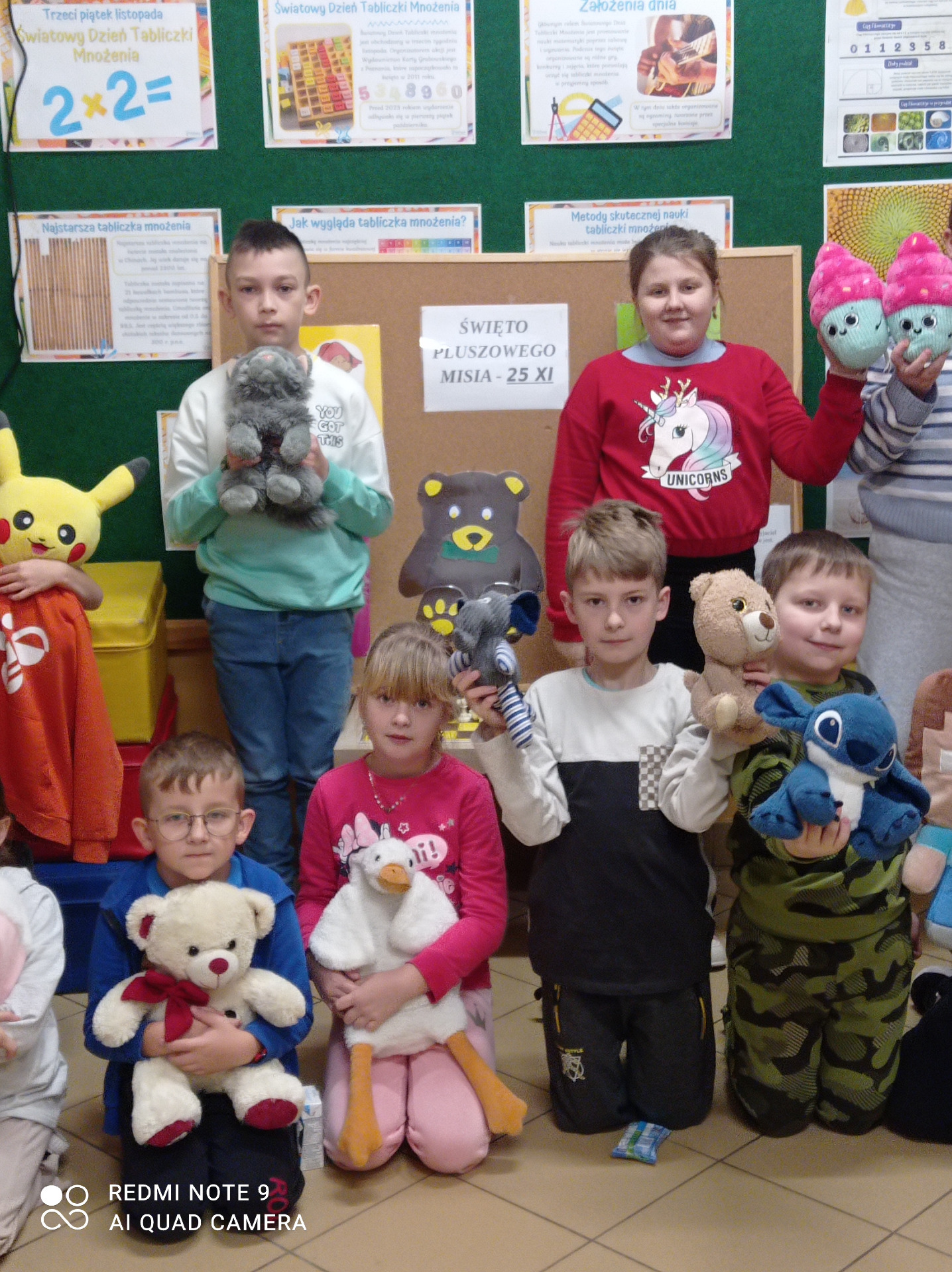 25 listopada obchodziliśmy Święto Pluszowego Misia. Niewiele rzeczy w dzisiejszym świecie wzrusza, pobudza ciepłe emocje, ma w sobie tyle dobra i łagodności, ile zawiera pluszowy miś. To często jedyny przyjaciel dziecka. 25 listopada nie jest przypadkową datą. To właśnie tego dnia przypada rocznica powstania pierwszej pluszowej zabawki w kształcie misia. Obchodzimy to święto od 2002r. Wszystkie dzieci klas młodszych przyniosły tego dnia swoje ulubione pluszaki. Zajęcia też były poświęcone misiom. Przypomniano historię powstania tego święta. Dzieci opowiadały o swoich misiach, wysłuchały fragmentu książki "Kubuś Puchatek" i ilustrowały ten fragment książki, śpiewały piosenki o misiu, robiły misiowe układanki, uczniowie na świetlicy zrobili wyklejankę misia za pomocą bibuły. Dzieci także wykonywały ćwiczenia gimnastyczne razem ze swoimi misiami i je przytulały. To był sympatyczny, miły i radosny dzień.