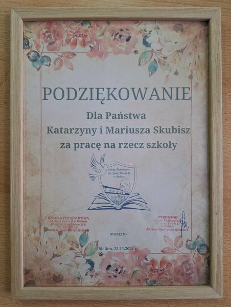 Serdecznie dziękujemy Państwu Katarzynie i Mariuszowi Skubiszom za wykonane na terenie szkoły prace. Dzięki Państwu nasi uczniowie będą mogli w pełni korzystać z nowo zakupionego kosza do koszykówki i rozwijać swoje pasje.