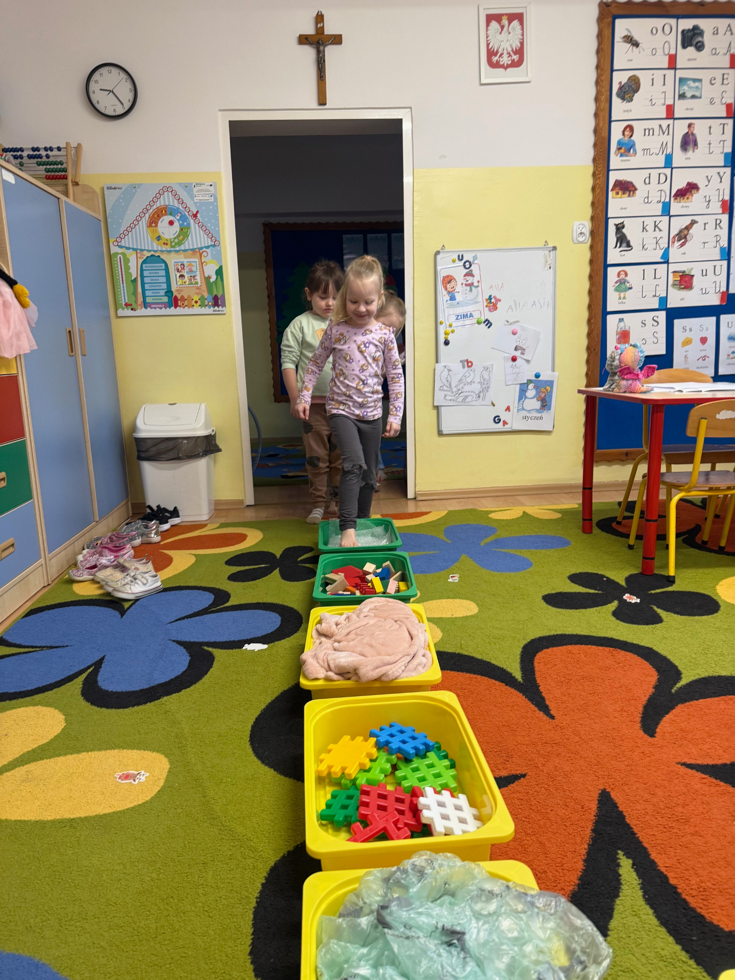 Przedszkolaki, w ramach udziału w projekcie czytelniczym „Mały Miś w świecie wielkiej literatury”, uczestniczyły w zajęciach z treningu uważności. Dzieci z uwagą wysłuchały bajki relaksacyjnej pt. „Domek leśnej babci” w towarzystwie Małego Misia. Były bardzo skupione, zrelaksowane, a także wyjątkowo uważne. Następnie Mały Miś zachęcił je do wykonania ćwiczeń, które pomagały rozwijać umiejętność skupienia się na teraźniejszości. Podczas zajęć wykorzystaliśmy sensoryczny tor przeszkód. Stosowaliśmy zasadę mindfulness podczas siedzenia, stania i chodzenia. Dzieci koncentrowały się na jedzeniu, zwracając uwagę na kształt, zapach, kolor i konsystencję posiłku. Delektowały się kwaśną cytryną, by poczuć jej intensywny smak. Na koniec wybraliśmy się na spacer, aby podziwiać przyrodę: dotykaliśmy trawy, drzew, słuchaliśmy odgłosów i podziwialiśmy kolory oraz kształty. Na podstawie tych aktywności stworzyliśmy „Zmisiowany uważnik”.