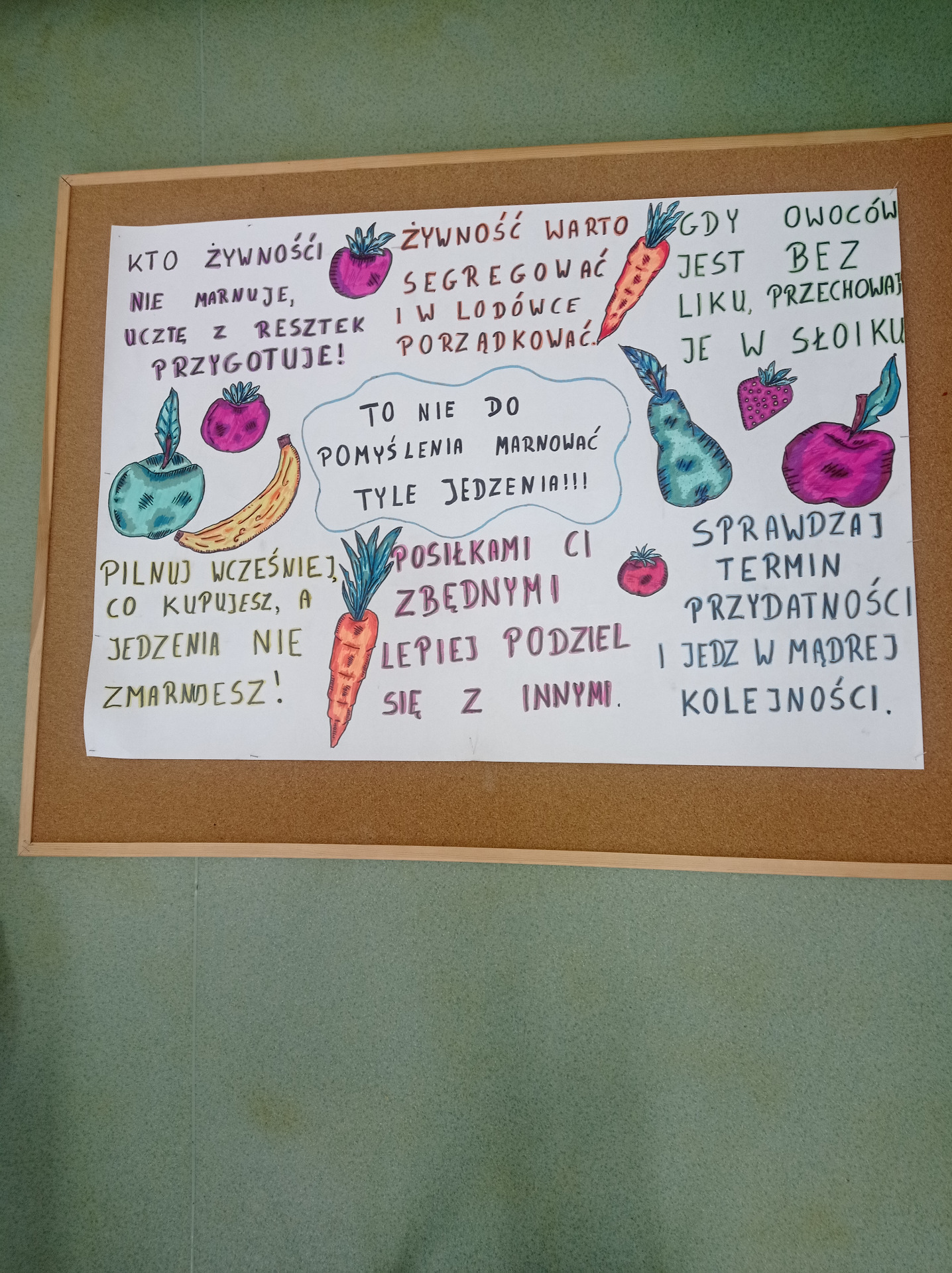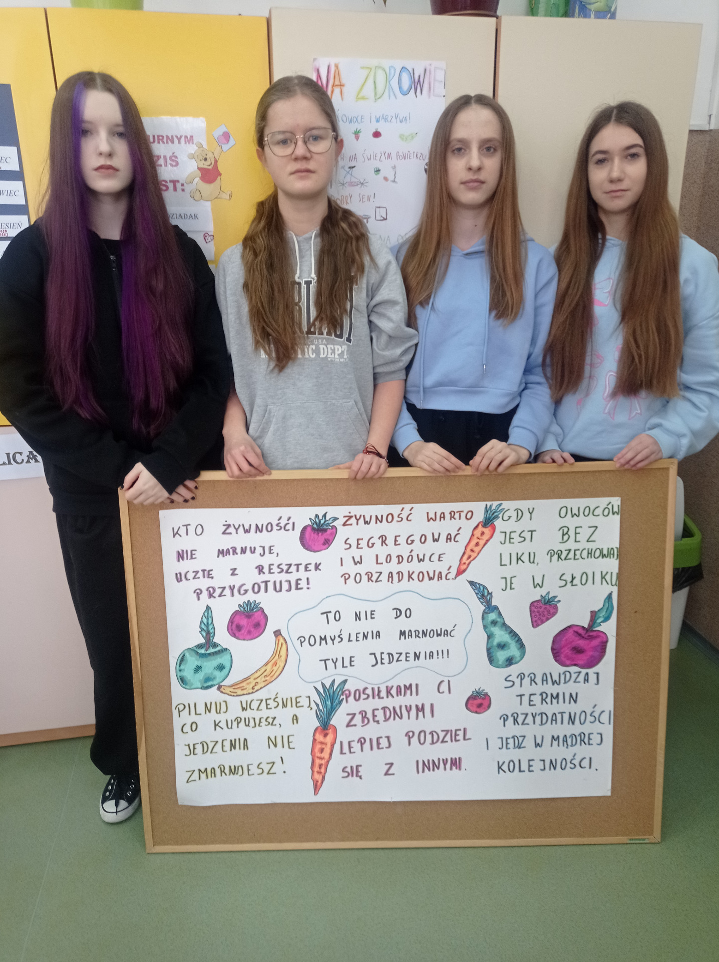 Uczennice klasy VIII - Luiza Łach, Maja Ślesicka, Maja Sieńkowska i Patrycja Nowacka wzięły udział w Ogólnopolskim Konkursie dla Uczniów Szkół Podstawowych na najlepszy plakat edukacyjny z zakresu niemarnowania żywności pt. „Żywności nie marnuję, planetę szanuję”, zorganizowany przez Junior-Edu-Żywienie (JEŻ). Jest to program MEiN i MZ dotyczący edukacji żywieniowej uczniów, który realizuje w tym roku szkolnym nasza szkoła. Celem Konkursu jest zainteresowanie uczniów problematyką konotowaną hasłem „żywność i żywienie” w kontekście poszanowania środowiska, a w tym niemarnowania żywności i wzmocnienie ich zaangażowania w te zagadnienia poprzez przygotowanie plakatu promującego zmniejszenie skali marnowania żywności.