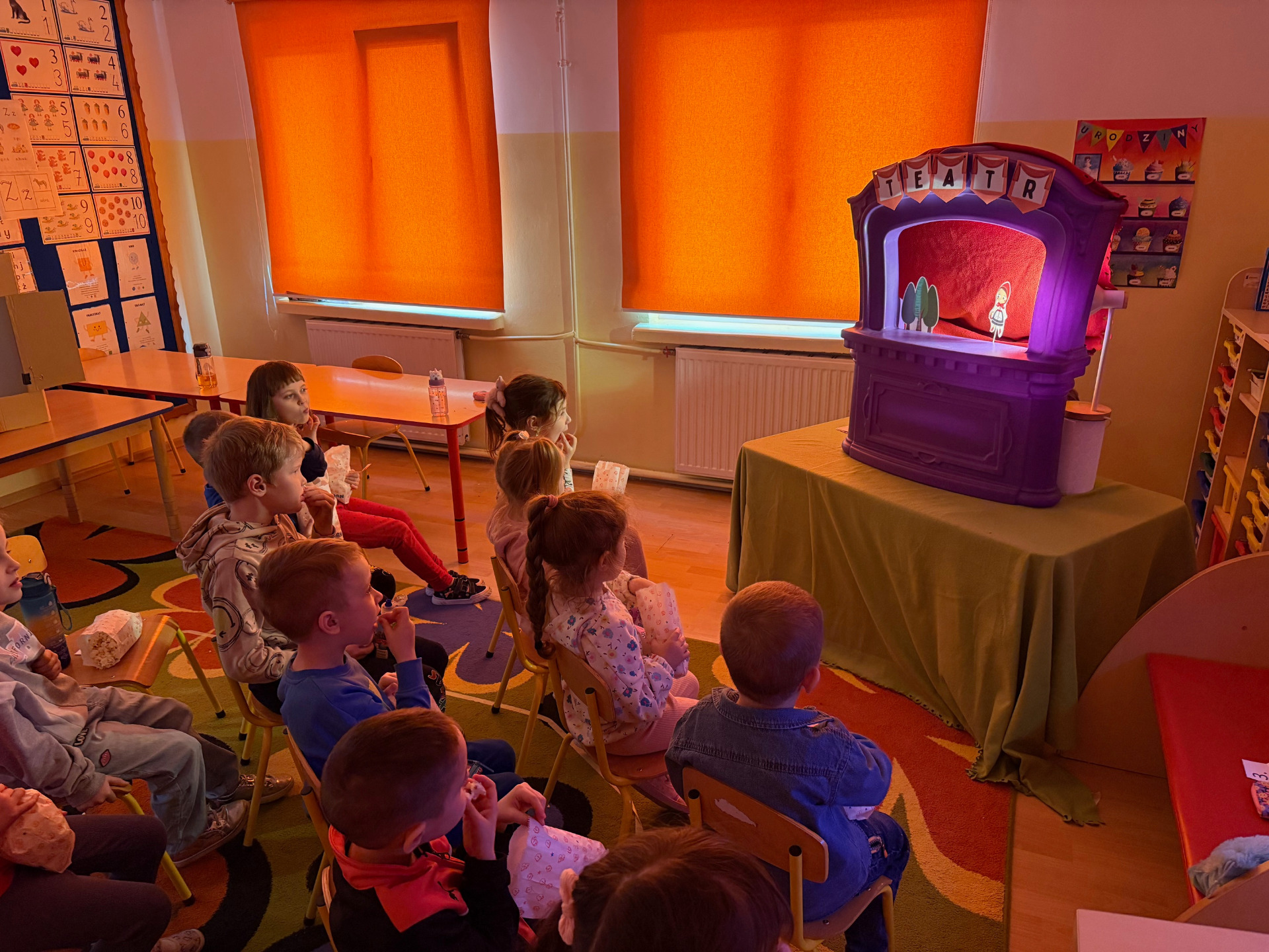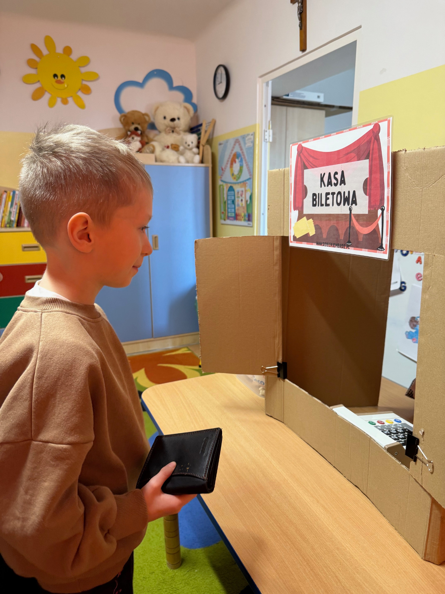 Przedszkolaki nauczyły się również zasad zachowania w teatrze, dowiedziały się, jak zakupić bilety i jak znaleźć swoje miejsce w sali. Następnie, kupując popcorn, obejrzały przedstawienie pt. „Czerwony Kapturek”, które zostało zaprezentowane w formie teatrzyku.