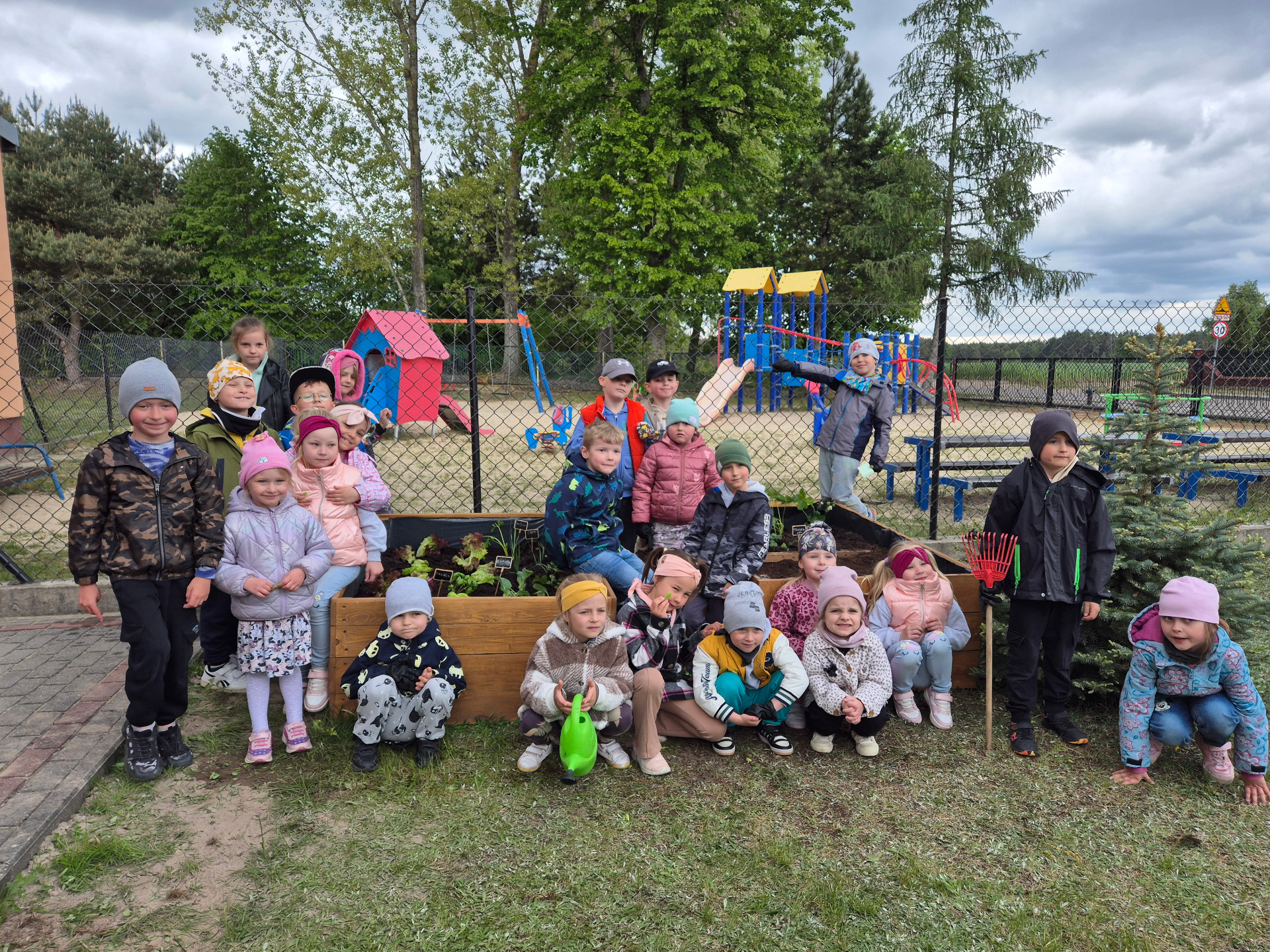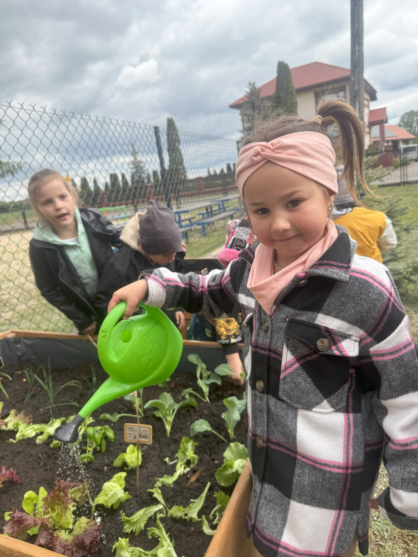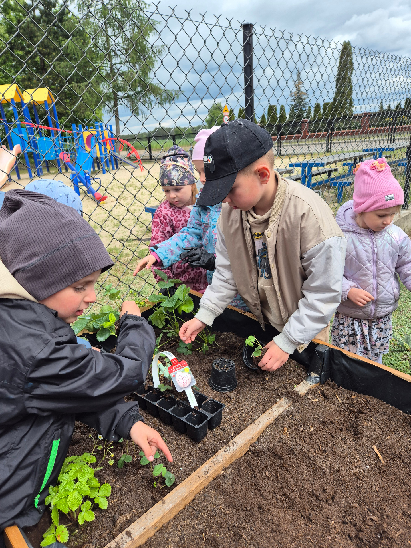 W specjalnie przygotowanych wcześniej drewnianych skrzyniach, po odpowiednim przygotowaniu ziemi, dzieci z zapałem sadziły warzywa i owoce: sałatę, bazylię, pory, selery, kapustę, kalafiory, a także poziomki i truskawki. Praca w ogrodzie była nie tylko świetną zabawą, ale również okazją do nauki.
