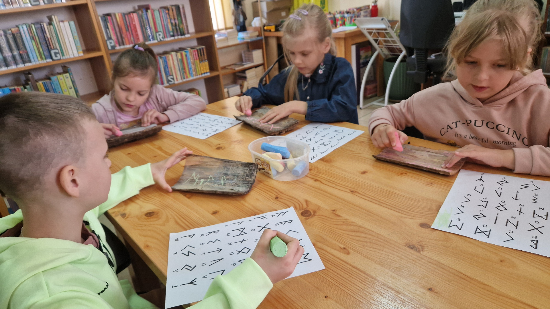 Podczas zajęć dzieci dowiedziały się, jak zapisać się do biblioteki oraz jak dbać o wypożyczone książki, by służyły innym czytelnikom jak najdłużej. Następnie, wykorzystując kawałki kory drzewa oraz kolorową kredę, uczniowie stworzyli własne, symboliczne podpisy – zapisując swoje imiona i nazwiska w kreatywny, niecodzienny sposób.