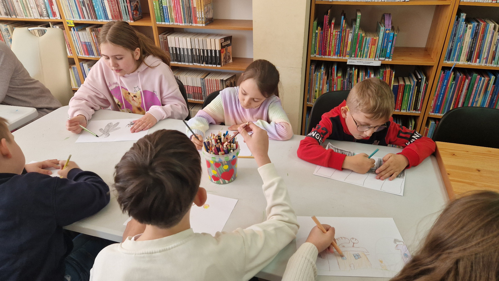 W kolejnej części spotkania dzieci wysłuchały bajki, którą przeczytał dyrektor biblioteki Pan Sławomir Pierzynowski. Po zakończeniu opowieści młodzi słuchacze musieli odgadnąć, za którą postać z bajki przebrał się pan dyrektor – było to nie lada wyzwanie, ale również sporo radości. Następnie uczniowie wykonali ilustracje do przeczytanej historii, z których pani bibliotekarka stworzyła pamiątkową książkę.