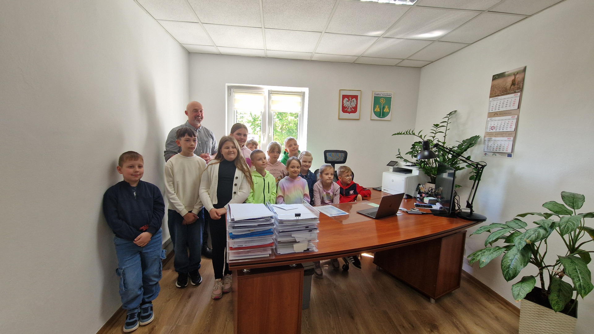 Po zakończeniu zajęć w bibliotece uczniowie udali się do Urzędu Gminy, gdzie zostali serdecznie powitani przez Pana Wójta Pawła Leszczyńskiego. Uczniowie dowiedzieli się, na czym polega praca wójta oraz mieli okazję zadać pytania dotyczące jego codziennych obowiązków. Spotkanie zakończyło się wspólnym, pamiątkowym zdjęciem oraz słodkim poczęstunkiem.