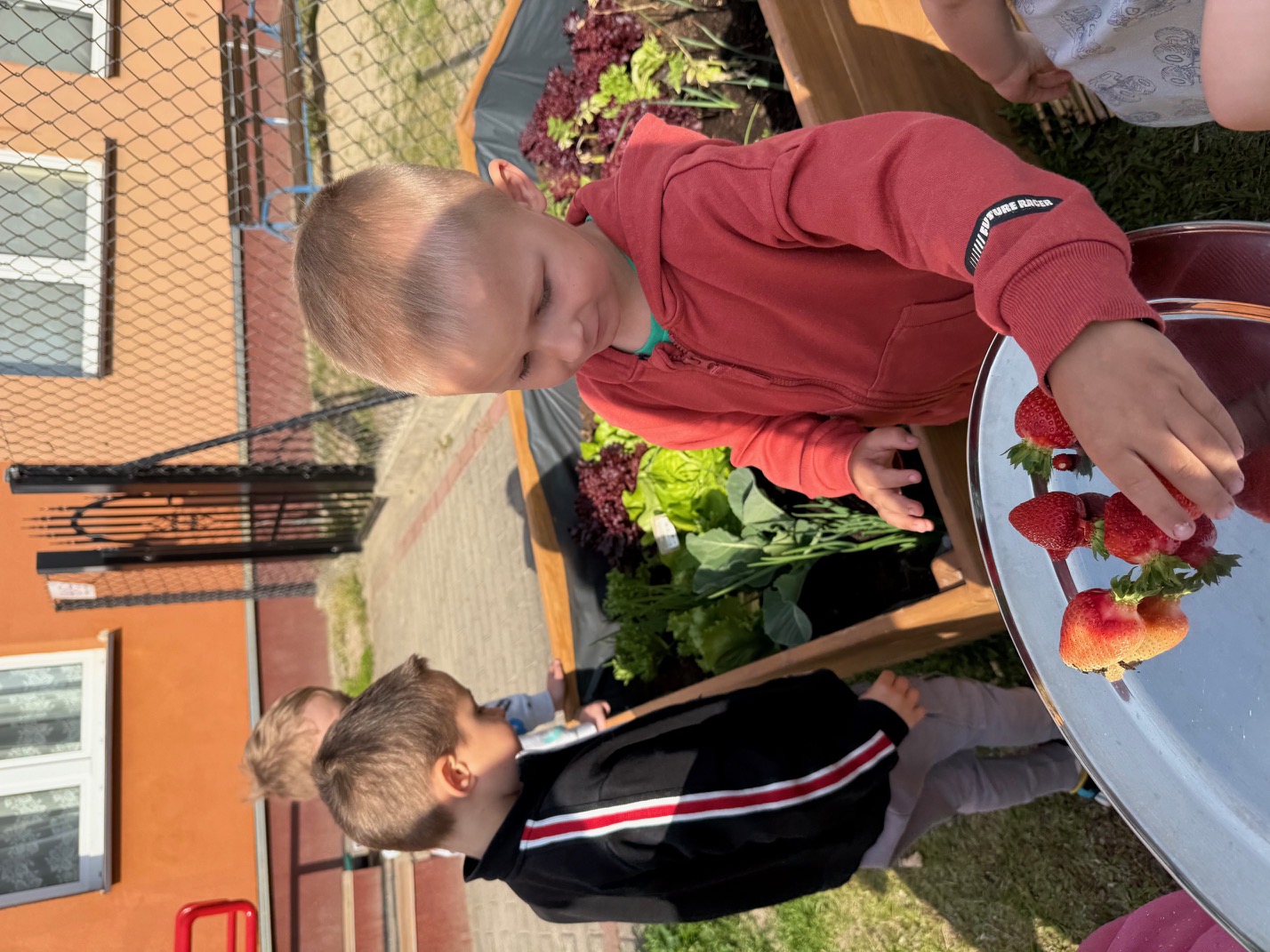 Na stołach królowały świeża sałata i aromatyczny szczypiorek i soczyste truskawki, które dzieci z dumą zebrały tuż przed przygotowaniem posiłku.
