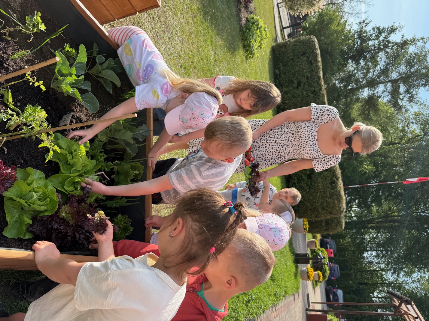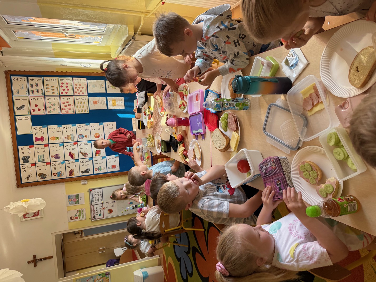 W ubiegłym tygodniu w oddziale przedszkolnym odbyło się wyjątkowe śniadanie. Przedszkolaki miały okazję samodzielnie przygotować zdrowe i kolorowe kanapki, wykorzystując warzywa z własnoręcznie pielęgnowanego ogródka przedszkolnego.