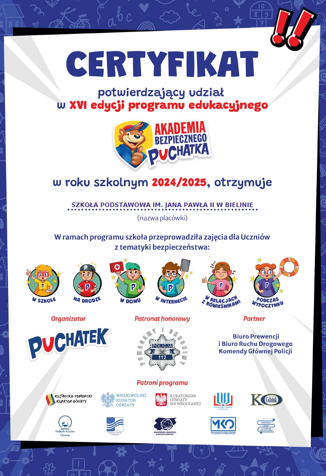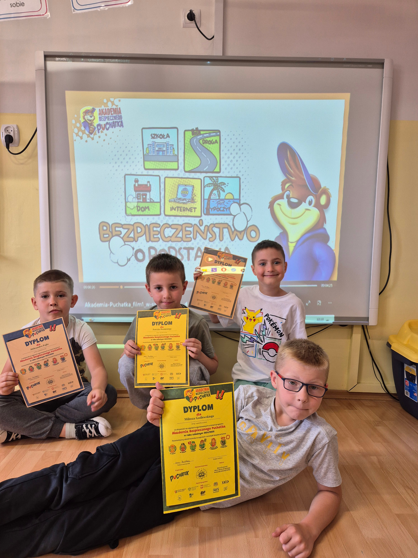 Po przeprowadzeniu zajęć, dzieci rozwiązały Ogólnopolski Test Bezpieczeństwa. Szkoła otrzymała Certyfikat „Akademii Bezpiecznego Puchatka”, a dzieci dyplomy.