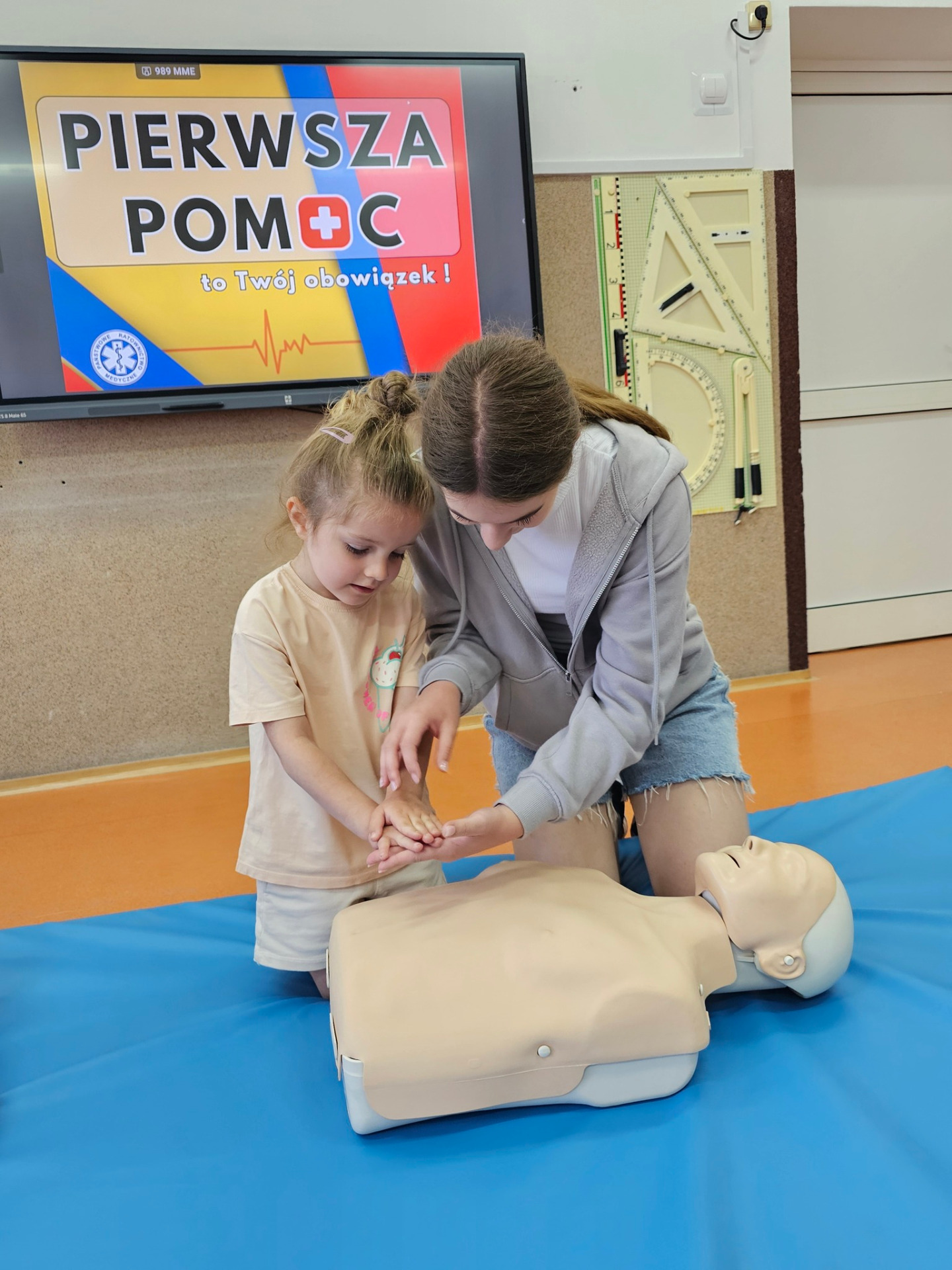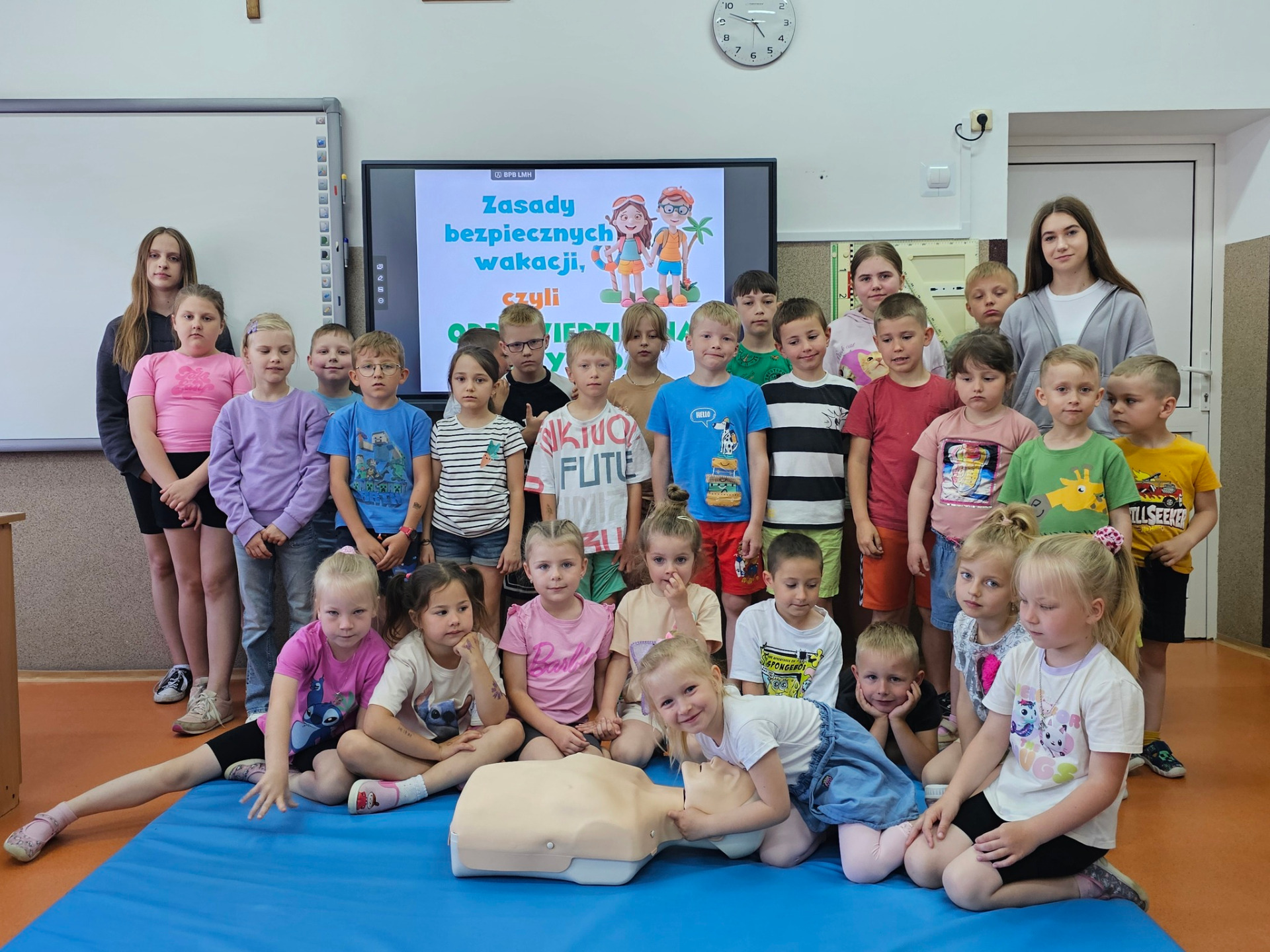 16 czerwca uczennice klasy 8 przeprowadziły zajęcia z zakresu udzielania pierwszej pomocy oraz przypomniały zasady bezpieczeństwa podczas wakacji młodszym kolegom i koleżankom. Podczas spotkania przekazały najważniejsze informacje o tym, jak reagować w przypadku nagłego zatrzymania krążenia (NZK), jak poprawnie wykonać wezwanie na numer alarmowy 112, a także jak bezpiecznie udzielać pomocy. Dzieci z ogromnym zaangażowaniem słuchały i uczestniczyły w ćwiczeniach, odpowiadały na pytania.