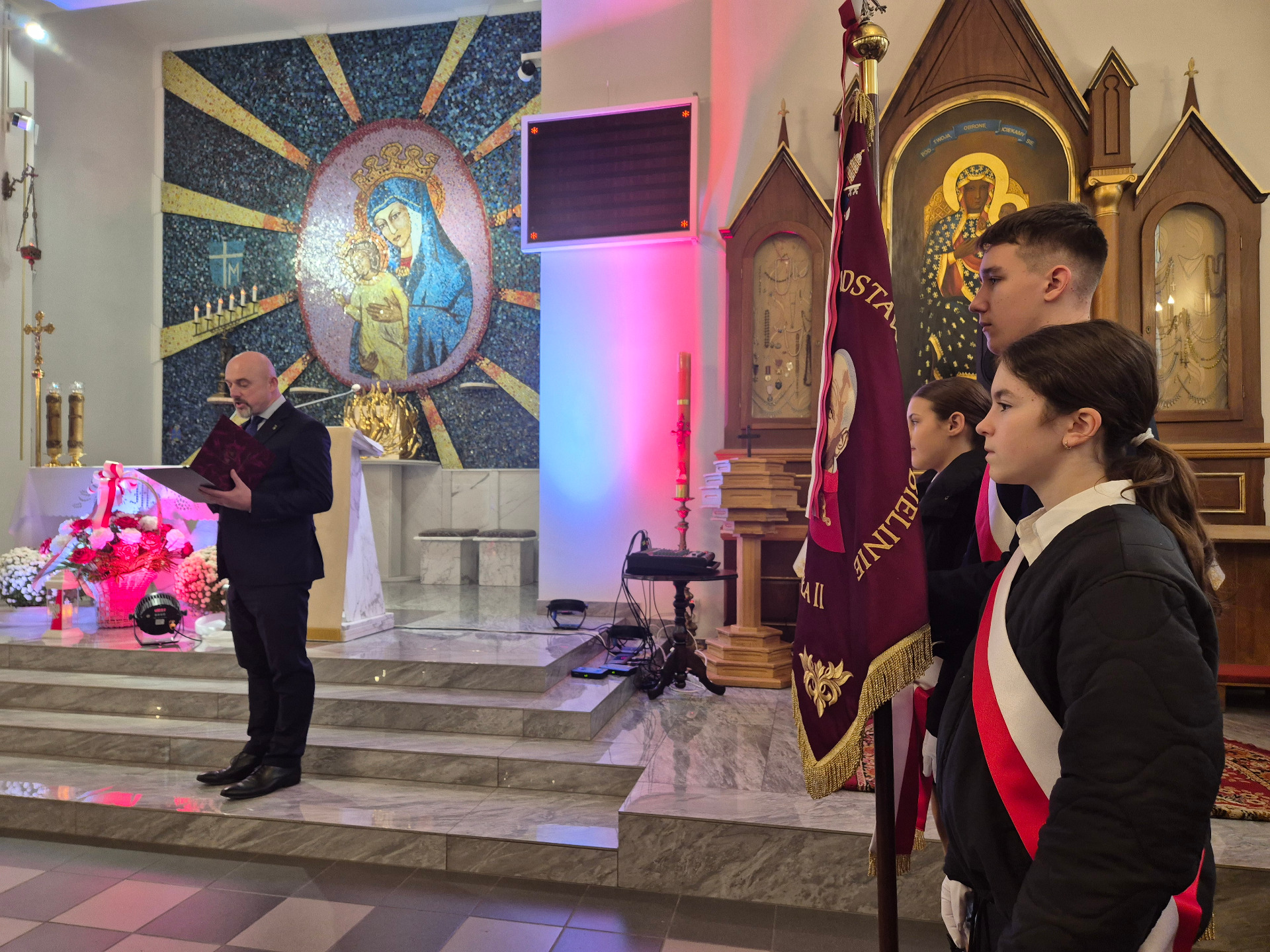 Nasi uczniowie, niosąc sztandar szkoły, z dumą reprezentowali społeczność szkolną podczas mszy świętej i wspólnego świętowania tego ważnego dla Polaków dnia. Obecność pocztu podkreśliła szacunek i przywiązanie naszej szkoły do tradycji narodowych oraz pamięci o bohaterach, którzy walczyli o wolność Ojczyzny.