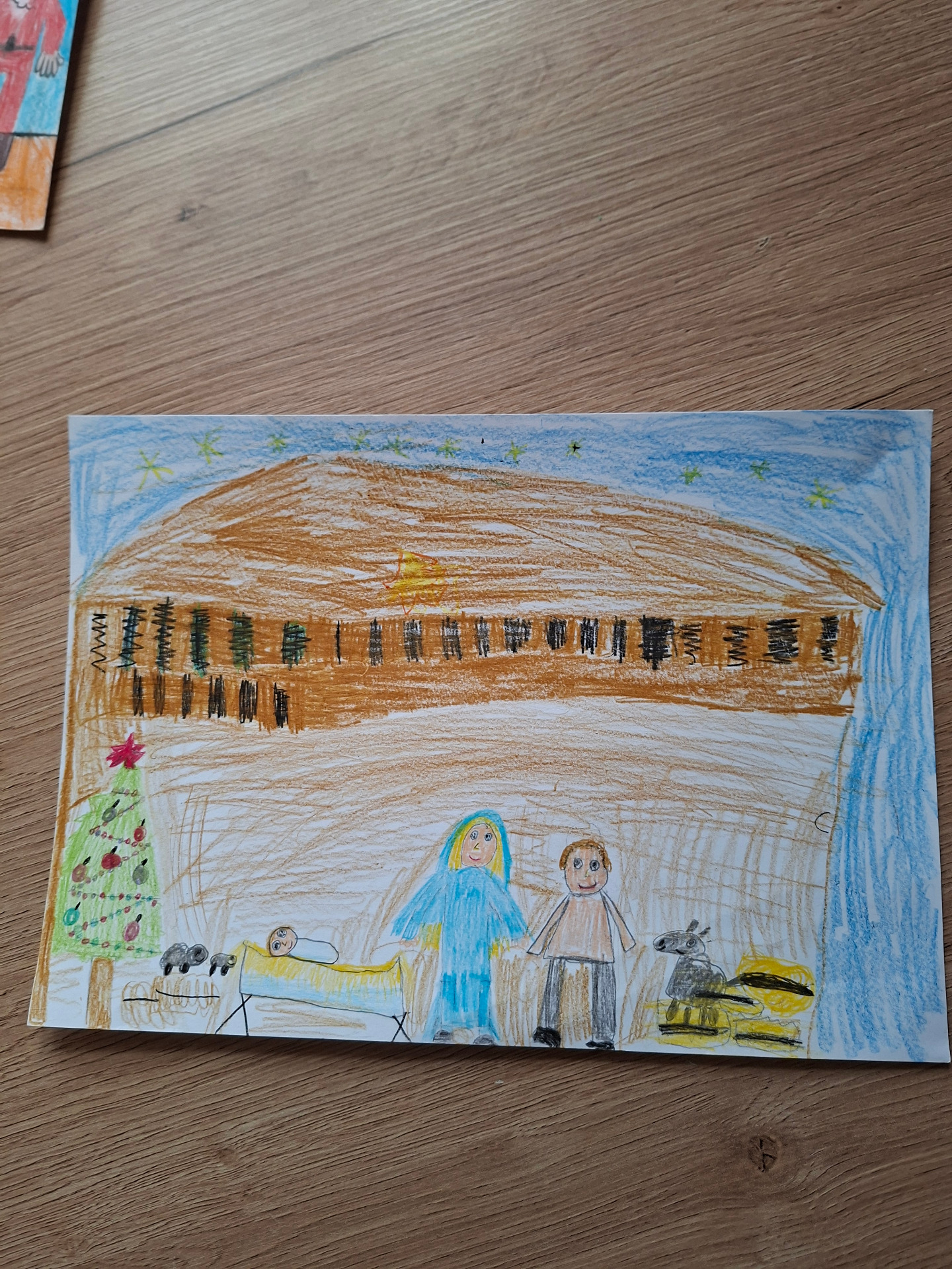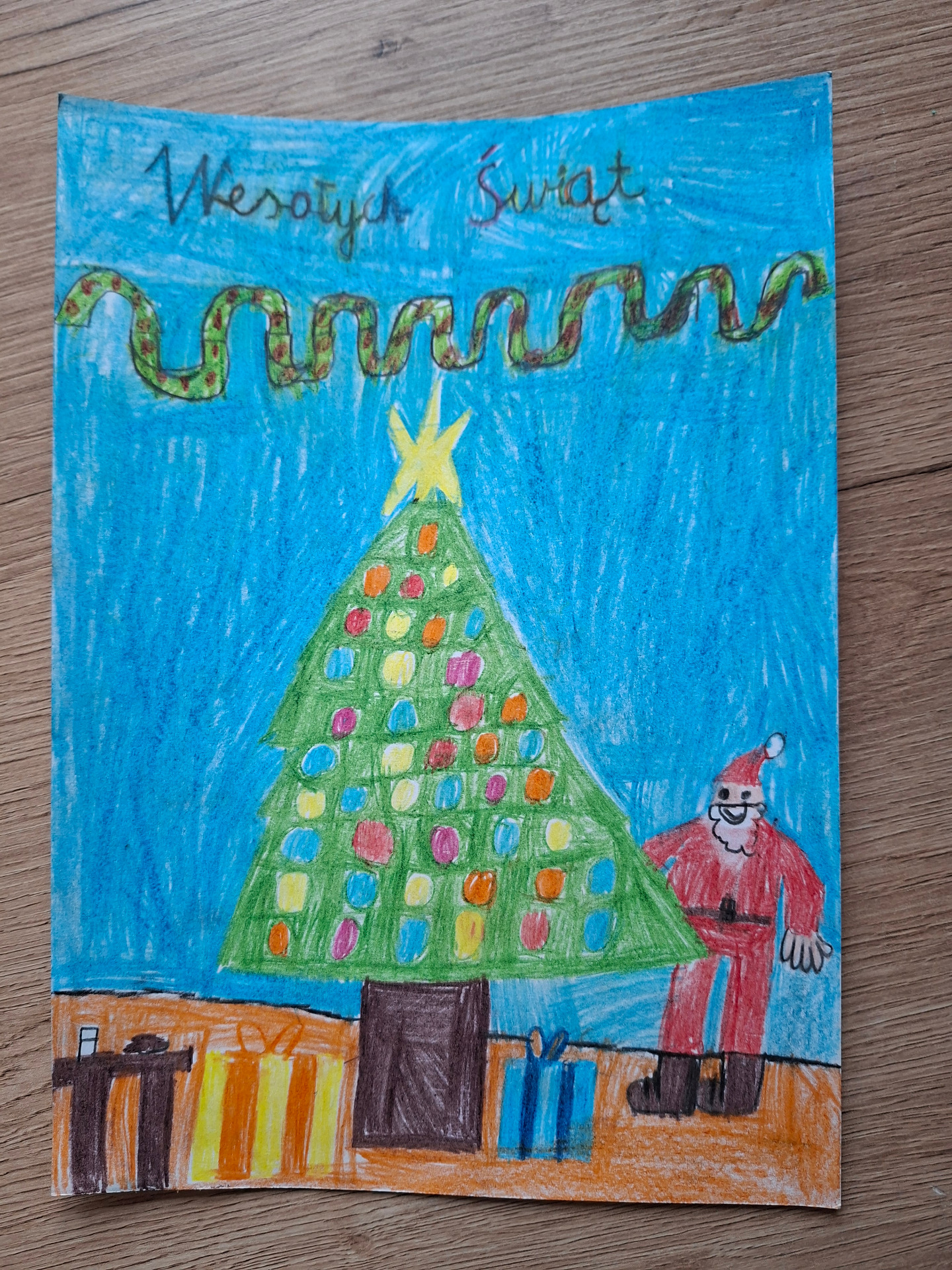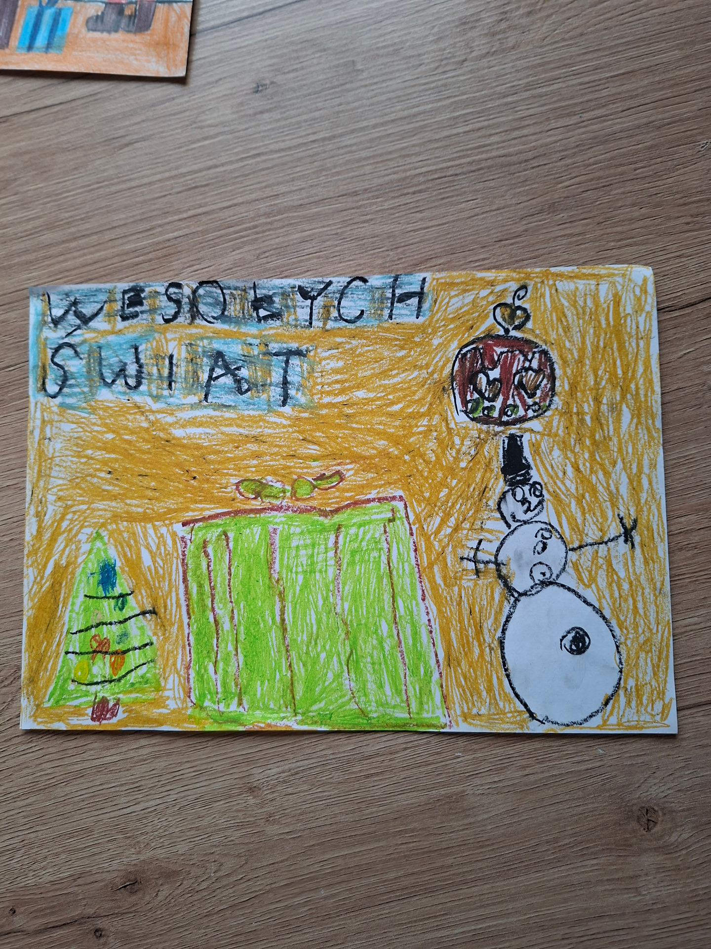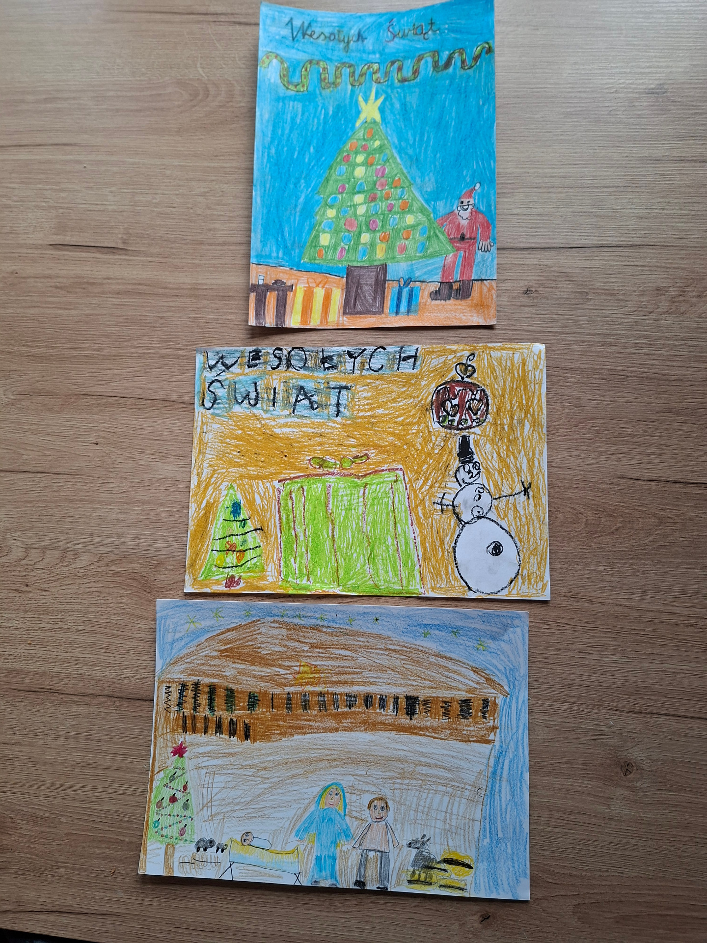 " Karta świąteczna wykonana ręką dziecka" - Wzięły w nim udział wszystkie dzieci klas młodszych, które na zajeciach plastycznych wykonaly kartki świąteczne.