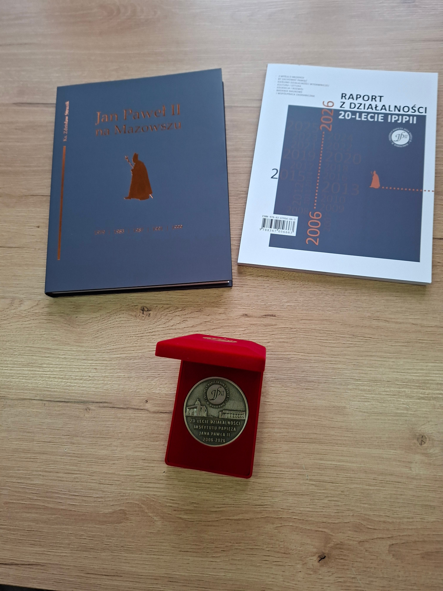 m.in. jest to nasza szkoła. Jako dowód wdzięczności otrzymaliśmy medal okolicznościowy, publikację jubileuszową "Jan Paweł II na Mazowszu" oraz Raport z działalności. 20-lecie IPJPII, które wzbogacą księgozbiór naszej biblioteki. Dziękujemy za upominki.