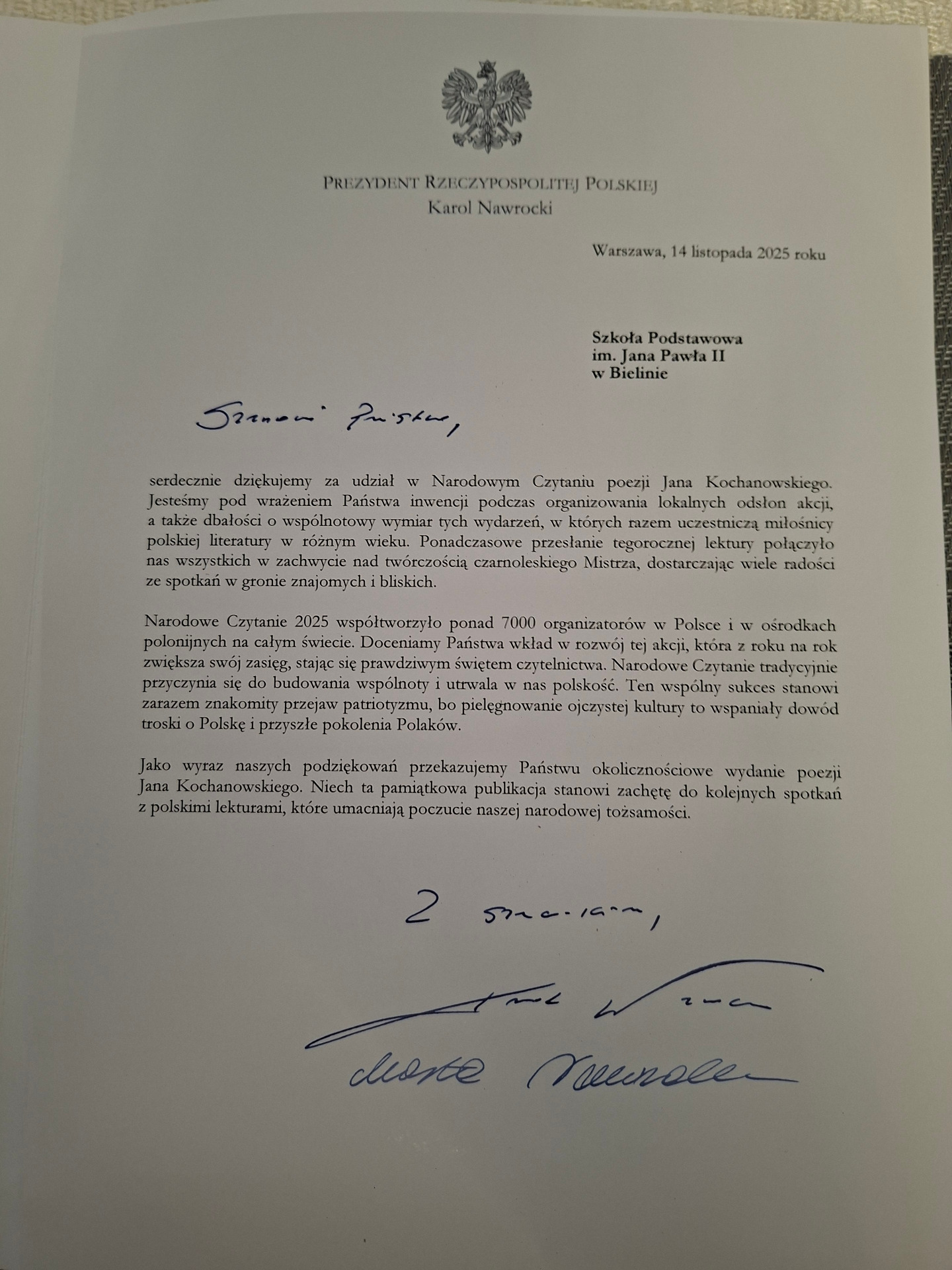 W podziękowaniu za udział w Narodowym Czytaniu poezji Kochanowskiego nasza szkoła otrzymała od Prezydenta Rzeczpospolitej Polskiej do biblioteki szkolnej okolicznościowe wydanie poezji Jana Kochanowskiego. Ta pamiątkowa publikacja ma stanowić zachętę do kolejnych spotkań z polskimi lekturami, które wzmacniają poczucie naszej tożsamości. Dziękujemy za ten dar.