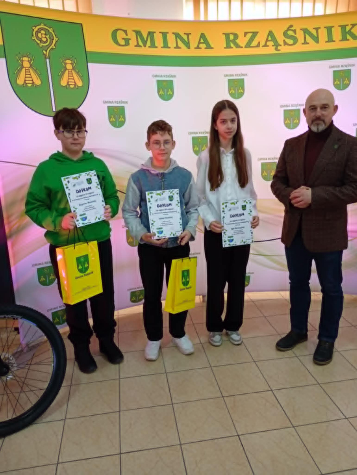 Laureaci otrzymali nagrody rzeczowe i dyplomy ufundowane przez Organizatora Gminy Rząśnik przy wsparciu Wojewódzkiego Funduszu Ochrony Środowiska i Gospodarki Wodnej w Warszawie. Nagrody otrzymali: Iga - wspaniały rower, Szymon - głośnik bezprzewodowy, Oskar - słuchawki nauszne. Uwieńczeniem uroczystości było złożenie gratulacji przez Pana Wójta Marka Leszczyńskiego, który zaszczycił nas swoją obecnością. Uroczystości towarzyszyły oklaski i radość . Uczniowie korzystali z obficie zastawionego stołu z łakociami.