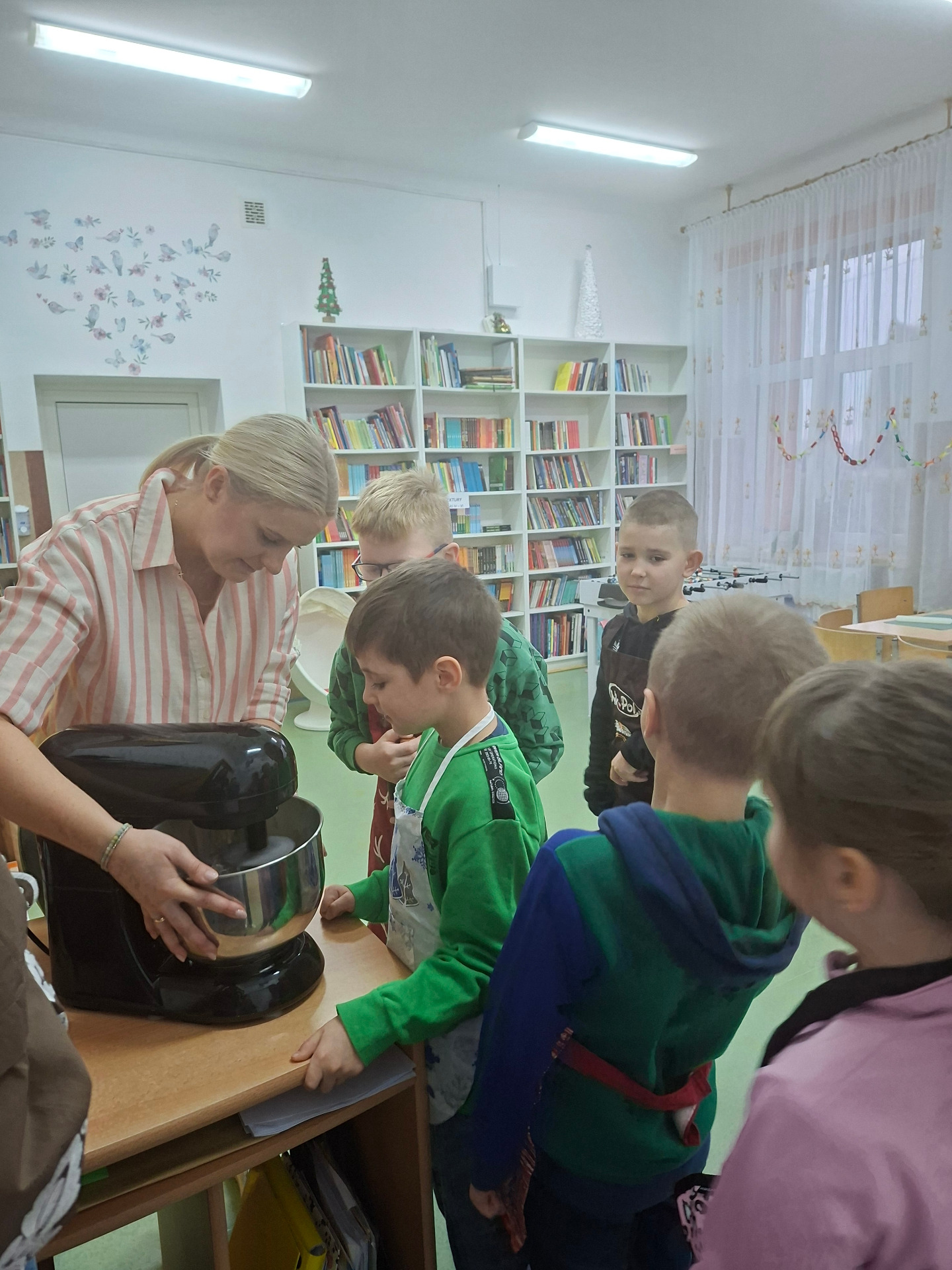 Najpierw dzieci poznały przepis na pierniczki, potem odmierzały składniki i wrzucały do miksera. Po uzyskaniu ciasta, uczyły sie wałkować i wykrawać foremkami kształty pierników. Druga część polegała na zrobieniu lukru i ozdabianiu nim pierniczków, a potem dekorowaniu ich kolorową posypką. Dzieci były zachwycone i dumne ze swojej pracy, wszędzie unosił się piernikowy zapach, który przypominał, że Święta już tuż, tuż!