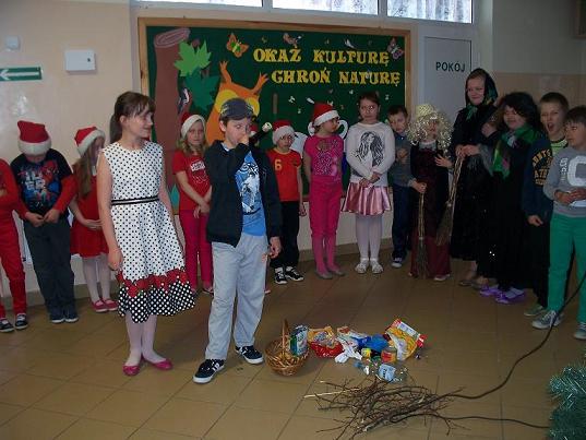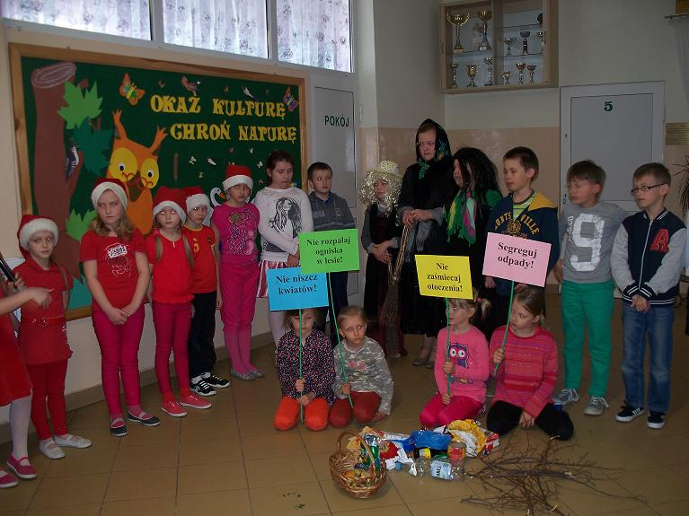 Na koniec przedstawienia wystąpili uczniowie oddziału przedszkolnego, które namawiały i prosiły o to, aby: nie zaśmiecać otoczenia, segregować odpady, nie niszczyć kwiatów i nie rozpalać w lesie ogniska.