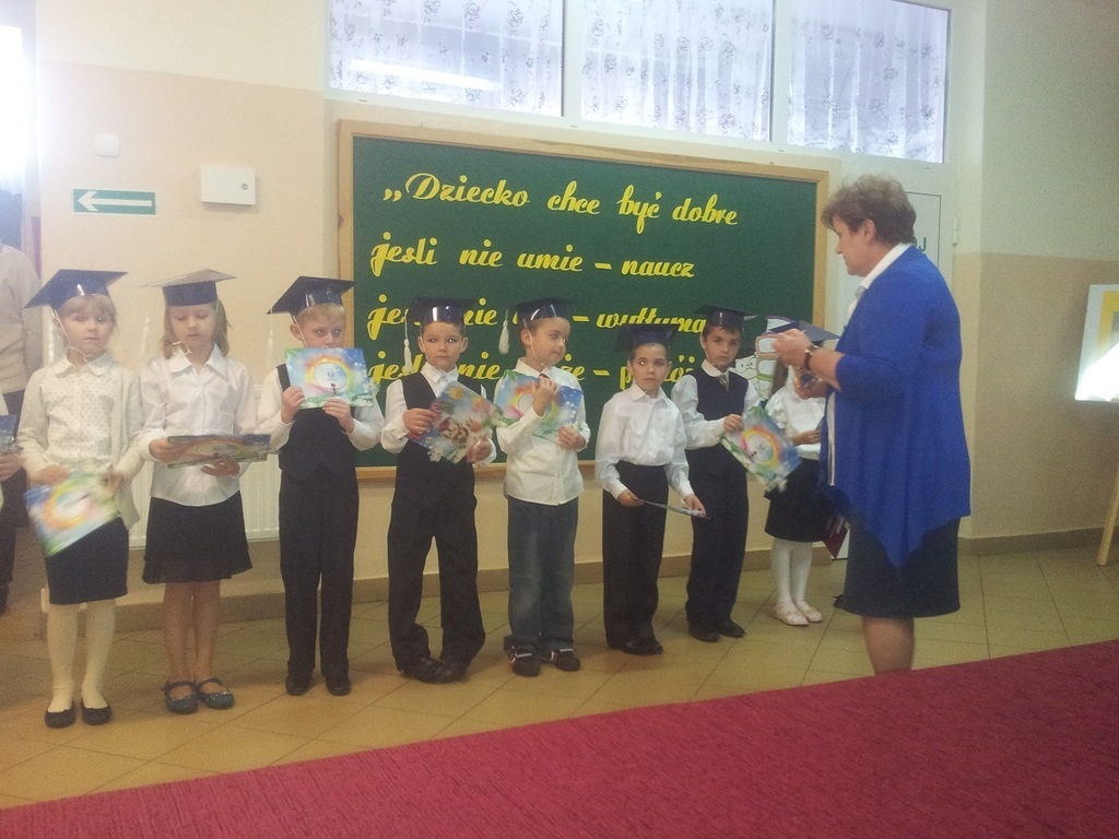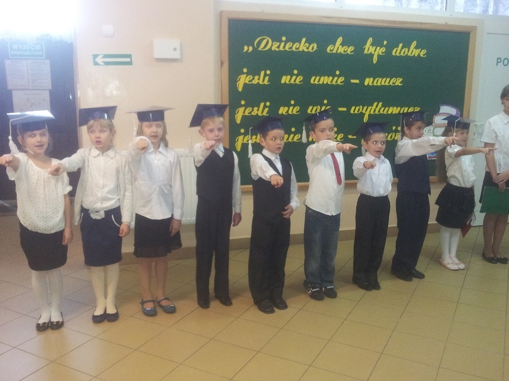 Pod opieką wychowawcy, pani Joanny Chmielewskiej, dzieci przygotowały część artystyczną, podczas której pożegnały się z przedszkolem i udowodniły, iż zasługują na przyjęcie do społeczności uczniowskiej. Dowodem na gotowość stania się uczniem klasy pierwszej miał być egzamin, który przeprowadziła wśród uczniów Karolina Dziewulska.